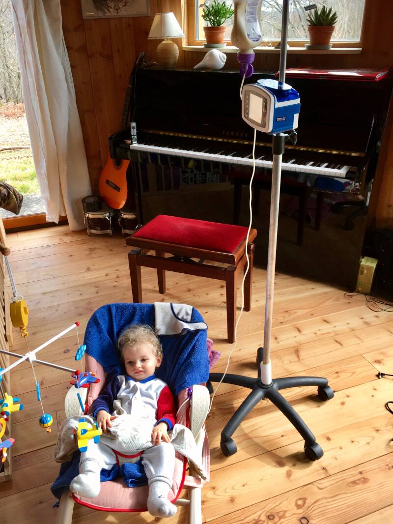 Mais tellement dur de le voir s’agiter lorsqu’on fait les soins de la gastrostomie ou lorsqu’on branche la sonde pour l’alimenter. Tellement rude de voir ce bouton intégré à son petit bidou. J’ai l’impression qu’on a transformé mon pti’ coeur en robot ! Tellement triste de ne plus pouvoir le manipuler aisément, sans crainte de lui faire mal, de ne plus pouvoir faire des chatouilles, de le lancer en l’air, de le prendre contre moi. Tellement dur de le voir dans l’impossibilité de ramper et donc de se déplacer (car c’était son seul mode de déplacement) à cause du bouton de gastrostomie sur le ventre. Et puis c’est un défi de tous les jours de trouver le bon débit et le bon dosage de lait que nous lui donnons par la gastrostomie. Car si c’est trop rapide et/ou trop volumineux, il vomit et n’a plus faim (et donc arrête de manger par la bouche), si c’est pas assez, il ne grossit pas et perd des forces. Pas de doses miracles, c’est au jour le jour, en observant Angelo, en calculant ce qu'il mange encore par la bouche et en le pesant régulièrement que nous allons trouver le juste équilibre…à réadapter sans cesse au fur et à mesure de sa croissance et de ses états. Tellement difficile de le contraindre à bouger le moins possible pendant 1h-1h30 pendant les alimentations 4 fois par jour (en plus d’une heure passée à lui proposer à manger par la bouche avant). Stressant à chaque alimentation de peur qu’il vomisse, qu’il tire sur la sonde et le bouton, que quelque chose tourne mal. Je vous passe encore tellement de détails de ce que nous vivons. Arrrrggghhh ! Mon dieu ! Comment est-ce possible de vivre ça ? Nous sommes dans un état lamentable !