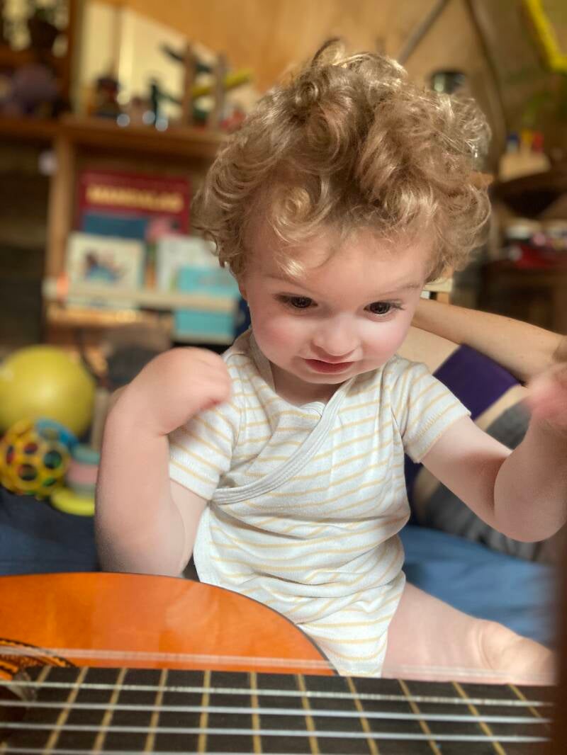 Et puis, il est notre petit Ben Harper, la guitare posée au sol, il aime nous faire découvrir des mélodies qu’il compose avec ses doigts ou avec des objets posés sur les cordes.